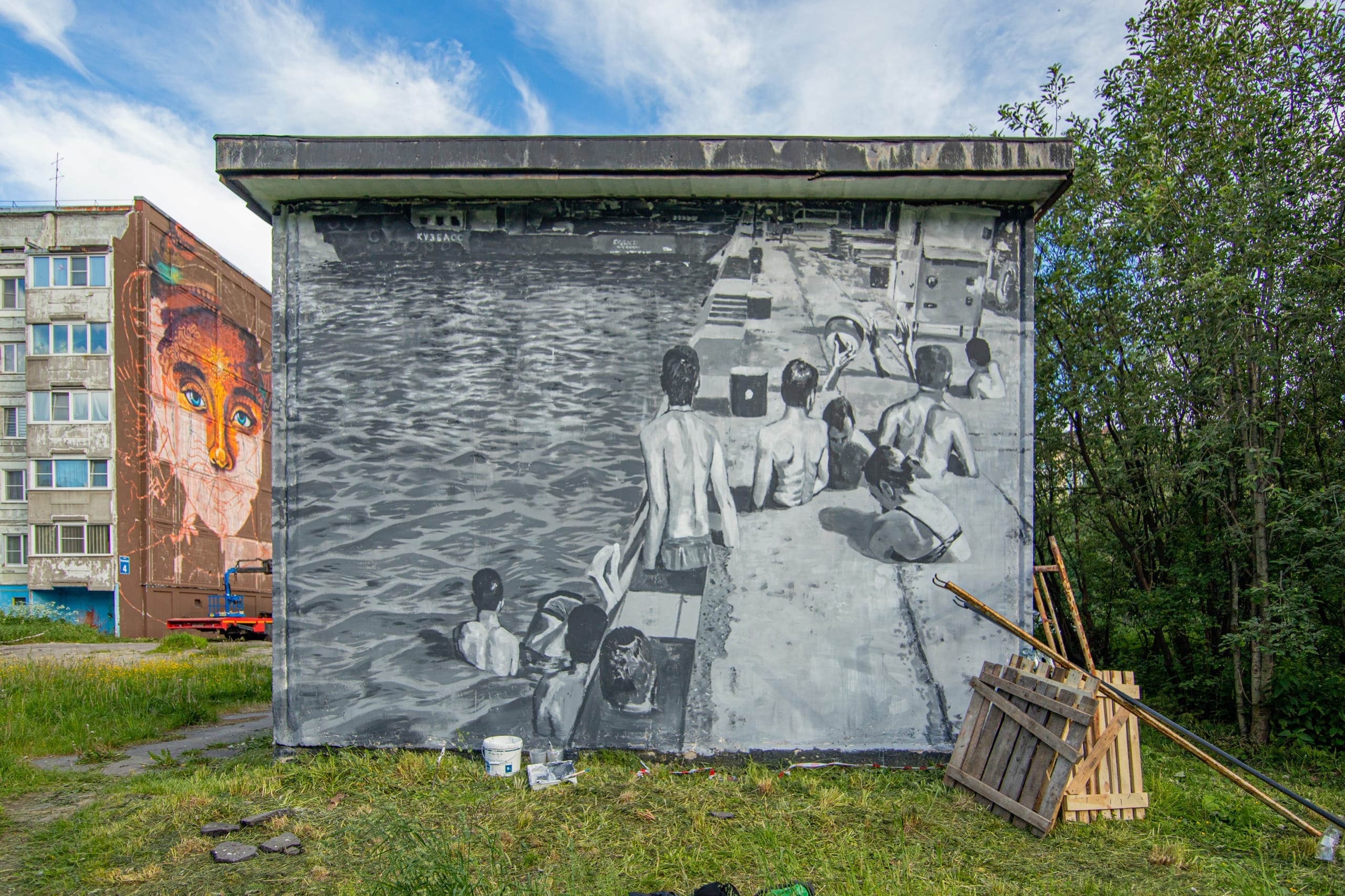 - Пространство не может решить всех проблем. Оно может дать более комфортную ежедневную среду, но, если человеку будет негде работать, он не вернется. Понятно, что искусство подсвечивает какие-то такие проблемы, добавляет акценты, но не решает проблему, а скорее еще раз говорит, что она существует. У нас целых два мурала на такую тему. Есть мурал про «бумажных мурманчан» — у нас очень много тех, кто прописан в городе, но не живет в нем. Это такие «бумажные» или «вахтовые» мурманчане, которые приезжают и уезжают. Так не только в Мурманске, но для нас это действительно проблема. Вся молодежь уезжает, и у нас очень маленькие молодежные сообщества.