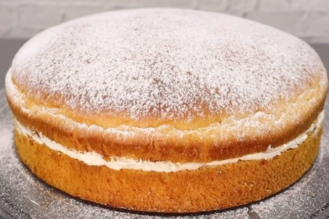 Ингредиенты: мука (200 грамм), масло сливочное (100 грамм), сахар (100 грамм), 2 яйца, разрыхлитель (1 чайная ложка), молоко (50 миллилитров). Для крема — сметана (200 грамм), сахарная пудра (100 грамм) и щепотка ванили.