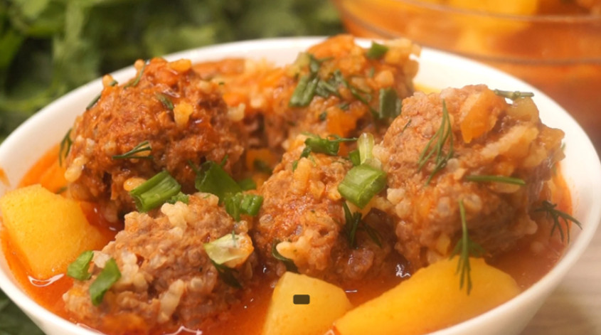 Поверх картошки выложить тефтели, закрыть крышкой и тушить на среднем огне 35-40 минут. Перед подачей можно посыпать зеленью.