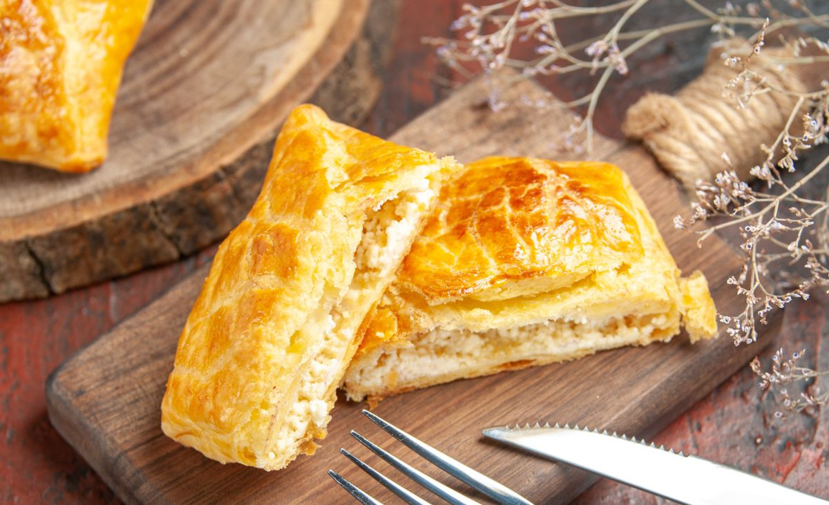 6. Раскатай охлаждённое тесто на три равных пласта, уложи их друг на друга, чередуя слоями подготовленной яблочной начинки.