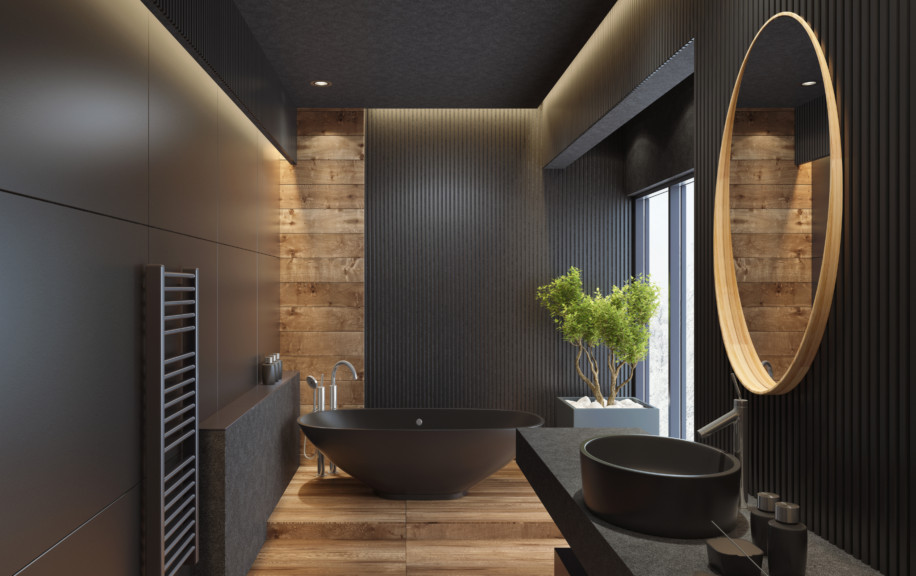2. Полностью чёрная ванная, раковина и унитаз