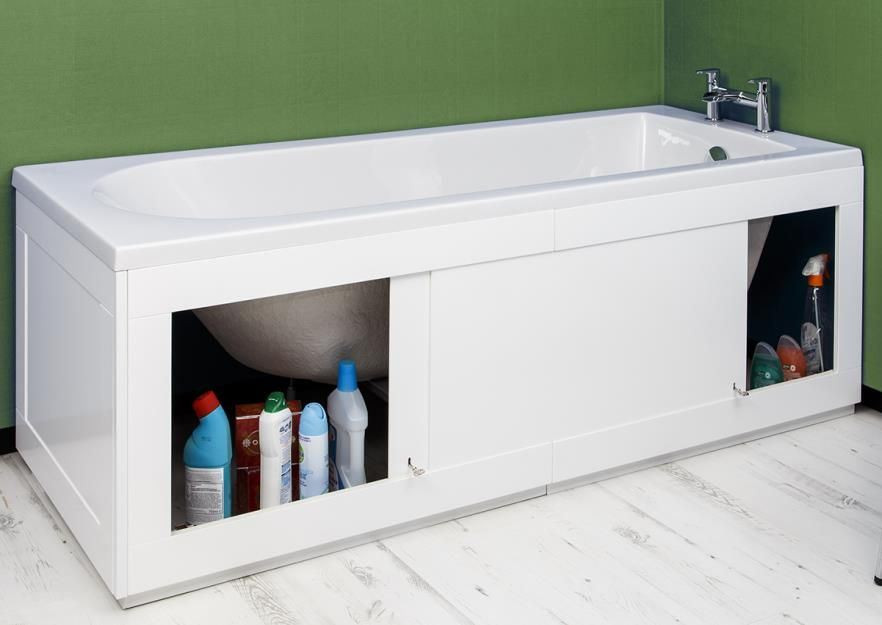 Это — опять же к вопросу небольших квартир с их маленькими ванными. Конечно, фартук из керамической плитки, облицовывающий фасад ванны, смотрится в разы «круче», чем пластмассовый экран, зато последний способен хранить в себе множество так нужных в этой комнате вещей — от средств гигиены и бытовой химии до… — по списку.