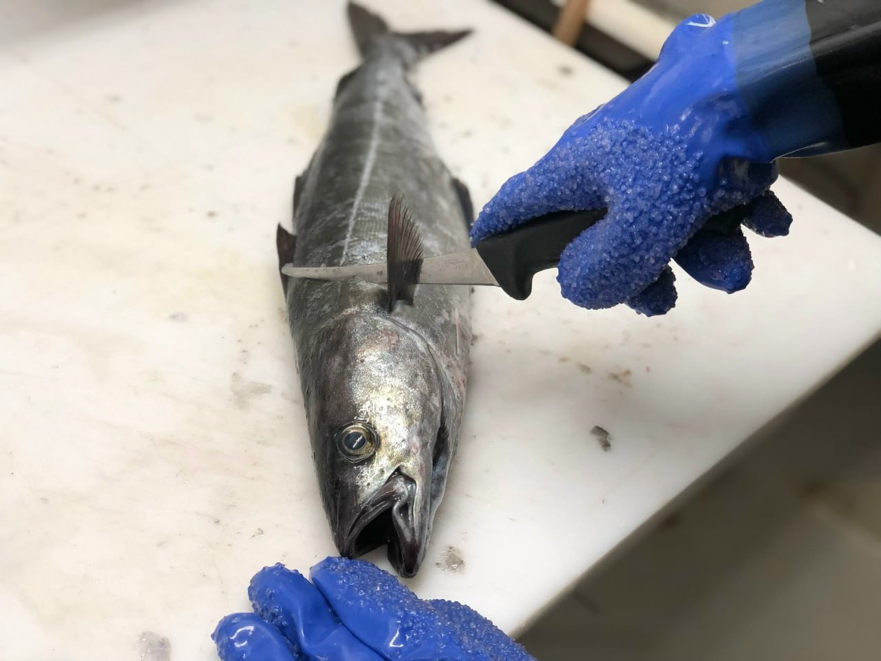 Тем временем рыбу нарезаем на не очень тонкие кусочки. У каждого кусочка внутренности поддеваем ножом и удаляем. Удаляем чёрную плёнку. Перемешиваем с луком и добавляем 40 г соли и 1 ч. л. сахара.