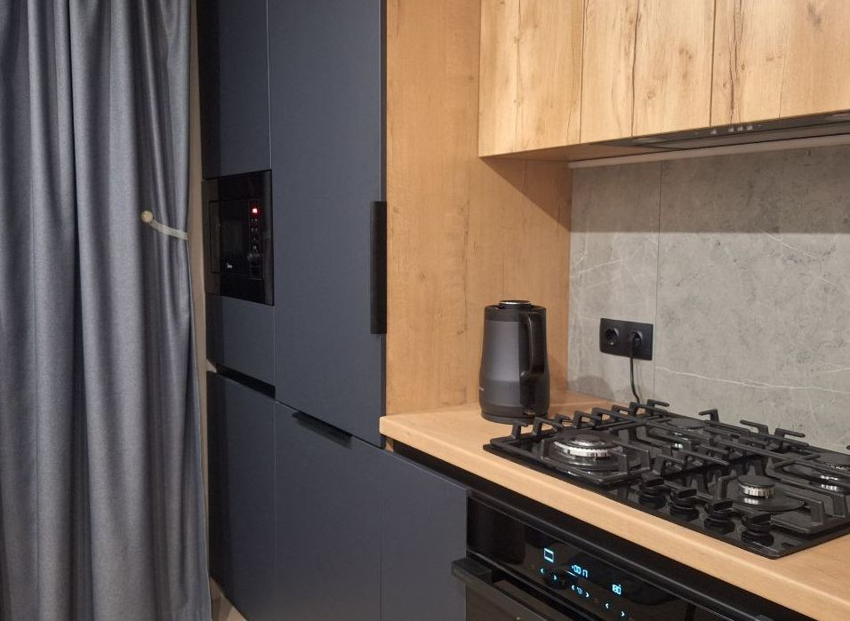 Оказалось, что наш ремонт — модный и красивый, но жить с таким ремонтом не всегда удобно, ведь приходится постоянно все отмывать. Мы выбрали тёмные фасады для кухни. На них очень чётко видны пятна и следы от наших рук. Также верхние шкафчики у нас открыты. И в них постоянно оседают пыль и жир.