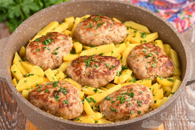 Чищенный и нарезанный как нравится, но не крупно, картофель выкладываем в жаровню, солим, перчим и перемешиваем. Вливаем горячую воду (чтобы картошку почти покрыла), сверху выкладываем обжаренные котлеты, накрываем и готовим на слабом огне 40 минут.