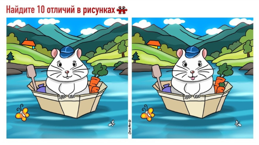 Перед нами картинка, на которой довольный хомяк плывёт на лодке по реке. Кажется, что две милейшие картинки одинаковые. Однако, это не так. На них есть 10 различий, которые и предстоит отыскать.
