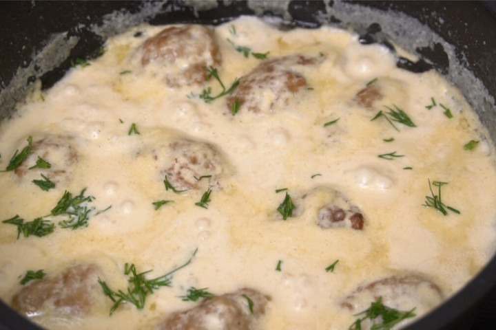 В кастрюле нагреваем 400 мл жирных сливок, добавляем туда 150 граммов плавленого сыра. Как он расплавится, складываем сюда обжаренные котлеты и томим их 25 минут на минимальном огне под крышкой.