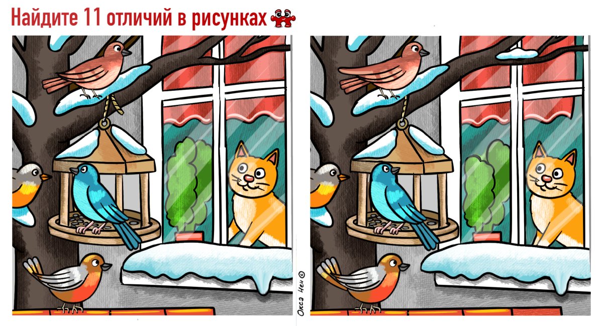 Зимой дома очень уютно, когда на улице снег и мороз. На рисунках, на которых надо найти 11 отличий, кошечка смотрит в окно, сидя на подоконнике.