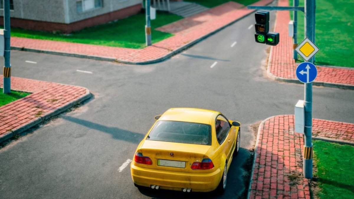 Перед вами — картинка. Представьте, что вы — водитель жёлтой машины. Обратите внимание на знаки и светофор. В каком направлении вам разрешено движение? Верный ответ ждёт вас в конце статьи.