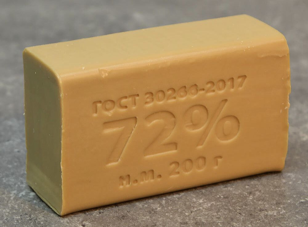 Хозяйственное мыло в Союзе начали делать в 30-е годы прошлого века по французскому рецепту. Его и сейчас изготавливают по тому же ГОСТу. Процент, выбитый на куске, означает содержание жирных кислот. Кроме двух типов животных жиров в составе присутствует желатин и щелочные металлы.