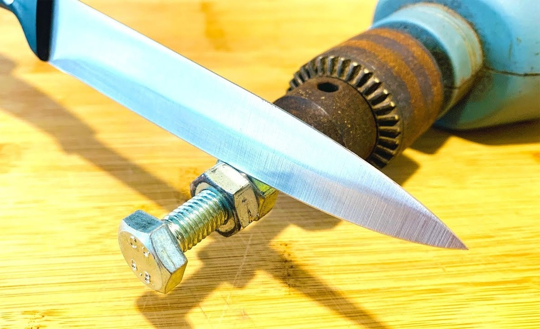 Вставляете болт в патрон и точите нож между двух гаек. Принцип получается такой же, как и у бытовой точилки, только скорость заточки быстрее.