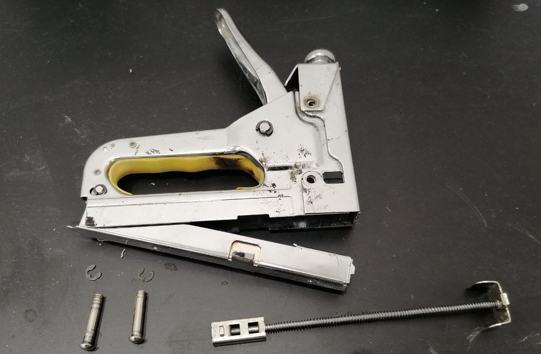Принцип работы мебельного степлера такой: «коромыслом» через рычаг поддевается корпус ударника, он поднимается вверх, пружина сжимается. Потом «клюв» коромысла соскакивает с ударного механизма и пластина (боек ударника) ударяет о скобу, загоняя её в материал. И если скоба не входит, а мнётся, то, значит, сила удара недостаточна, потому что ослабла пружина.
