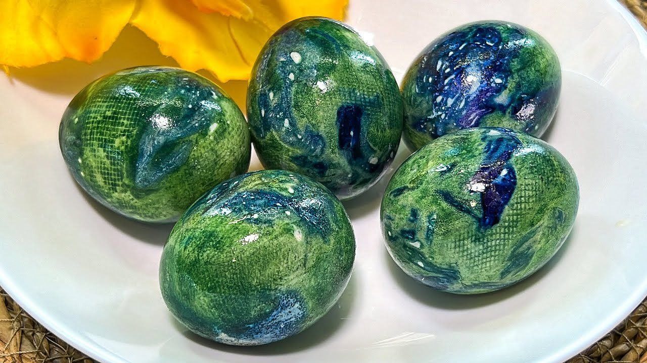 Красиво выглядят яйца с эффектом мраморных разводов. Смочите яйцо водой и обваляйте в обрывках цветной бумаги. Заверните в тряпочку, зафиксируйте нитью и воспользуйтесь луковым или пищевым красителем. Снимите материю, когда яйца остынут.