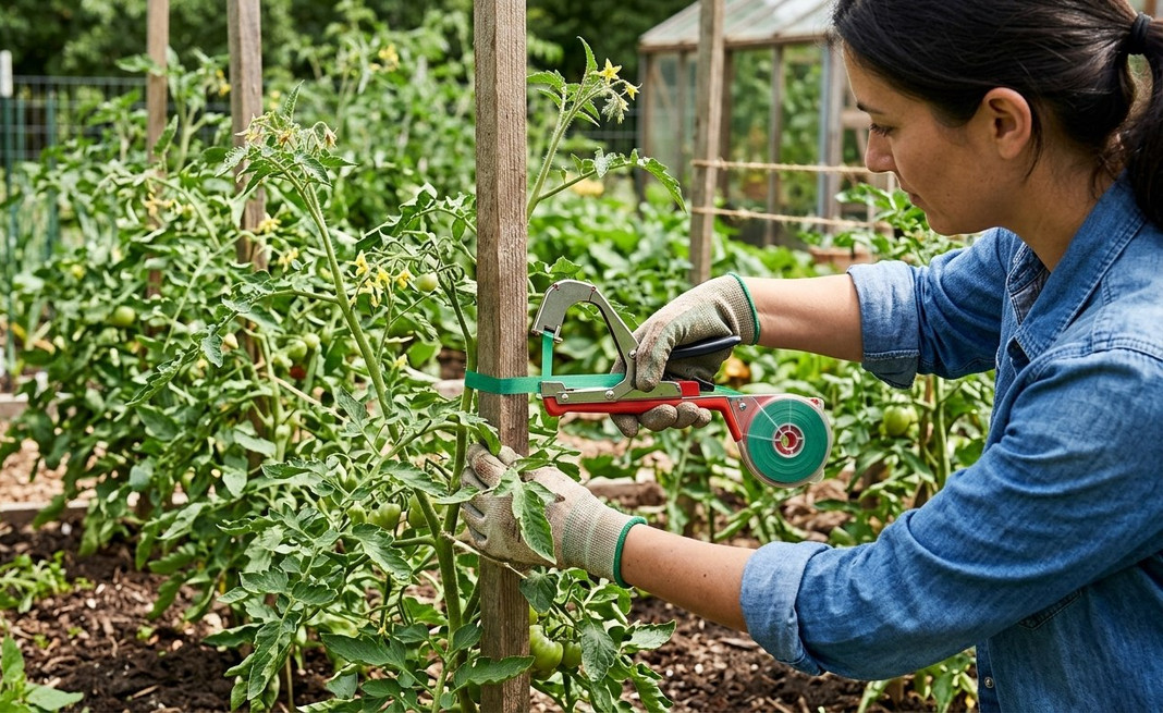 Это — незаменимая вещь для подвязки растений. Всего одно нажатие, и прибор обхватывает стебель с опорой лентой, надёжно фиксирует её скобой и тут же обрезает. Петля получается аккуратной и бережной, а сама операция занимает пару секунд.