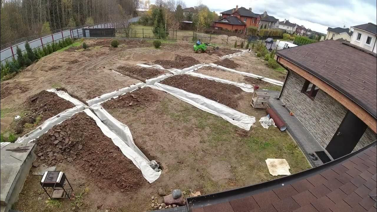 Пока роете траншеи, не ленитесь проверять уклон. Дно засыпьте песком, а сверху разровняйте щебень. Монтируя лотки и трубы, делайте стыки по ходу воды, чтобы она уходила беспрепятственно.