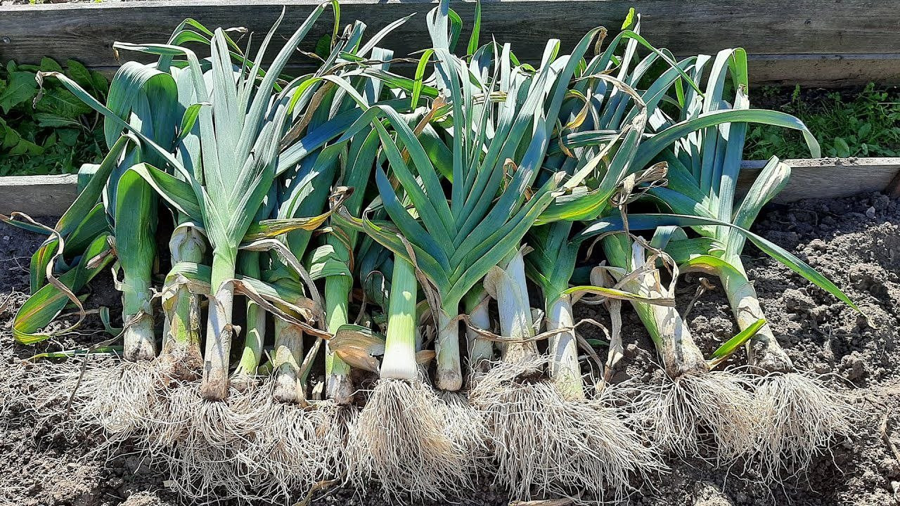 На грядки порей идёт, если стебель толще 5 мм. Время с момента посева — 55-60 дней — это примерно конец мая-начало июня, когда почва достаточно прогреется. Подготовьте грядки, перекопав их и внеся органику, суперфосфат и сернокислый калий. Схема посадки саженцев — 35 на 20 см. Заглубляйте их на 6-8 см. регулярно поливайте и рыхлите землю.