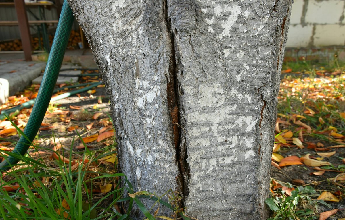Лопнувшая или потрескавшаяся на дереве кора — явление совсем нередкое. Виной тому и жгучее весеннее солнце, и случайные удары газонокосилкой, и ошибки при обрезке. Главное — не затягивать с лечением, иначе в рану попадёт инфекция и дерево начнёт гибнуть.
