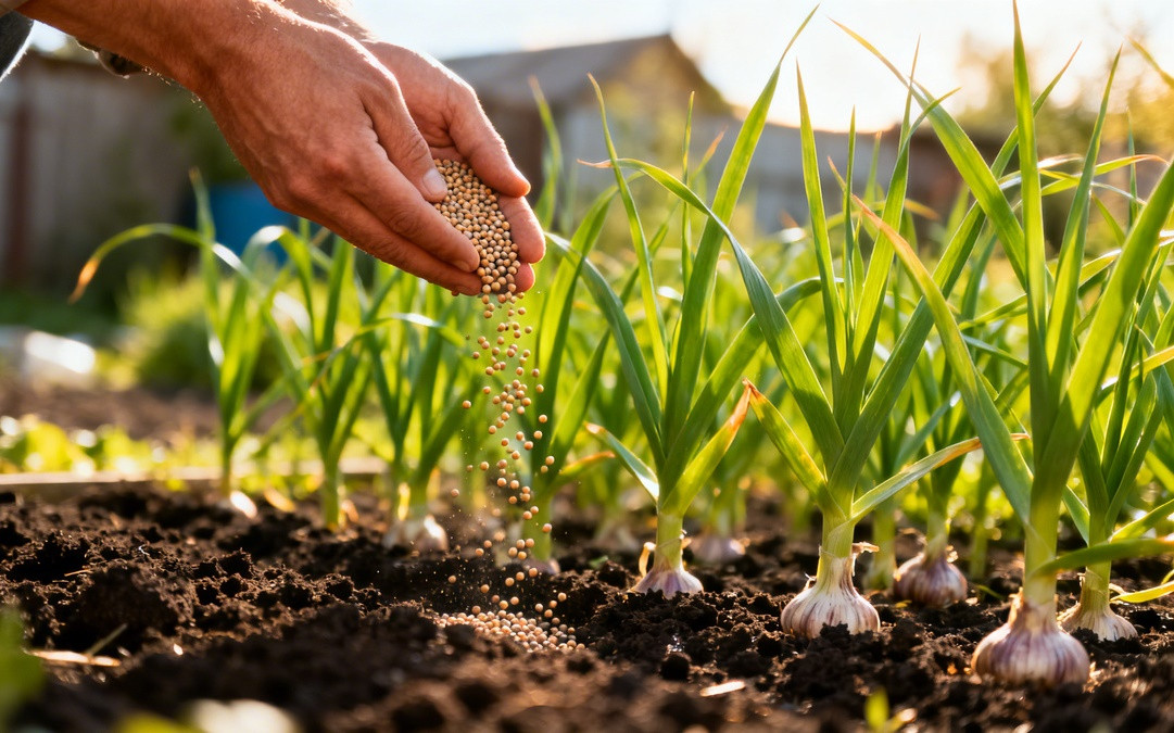 Он регулирует обмен веществ, повышает устойчивость чеснока к погодным перепадам и способствует формированию крупных и плотных головок.