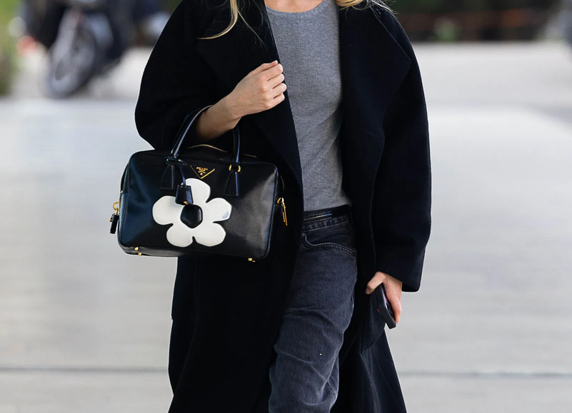 Представьте лаконичный универсальный образ: чёрное пальто, тонкий серый джемпер и тёмно-серые джинсы-мом. И здесь — бац! — врывается акцентная сумка с ярким мотивом ромашек! Образ видоизменён, но в стильную сегодня сторону!