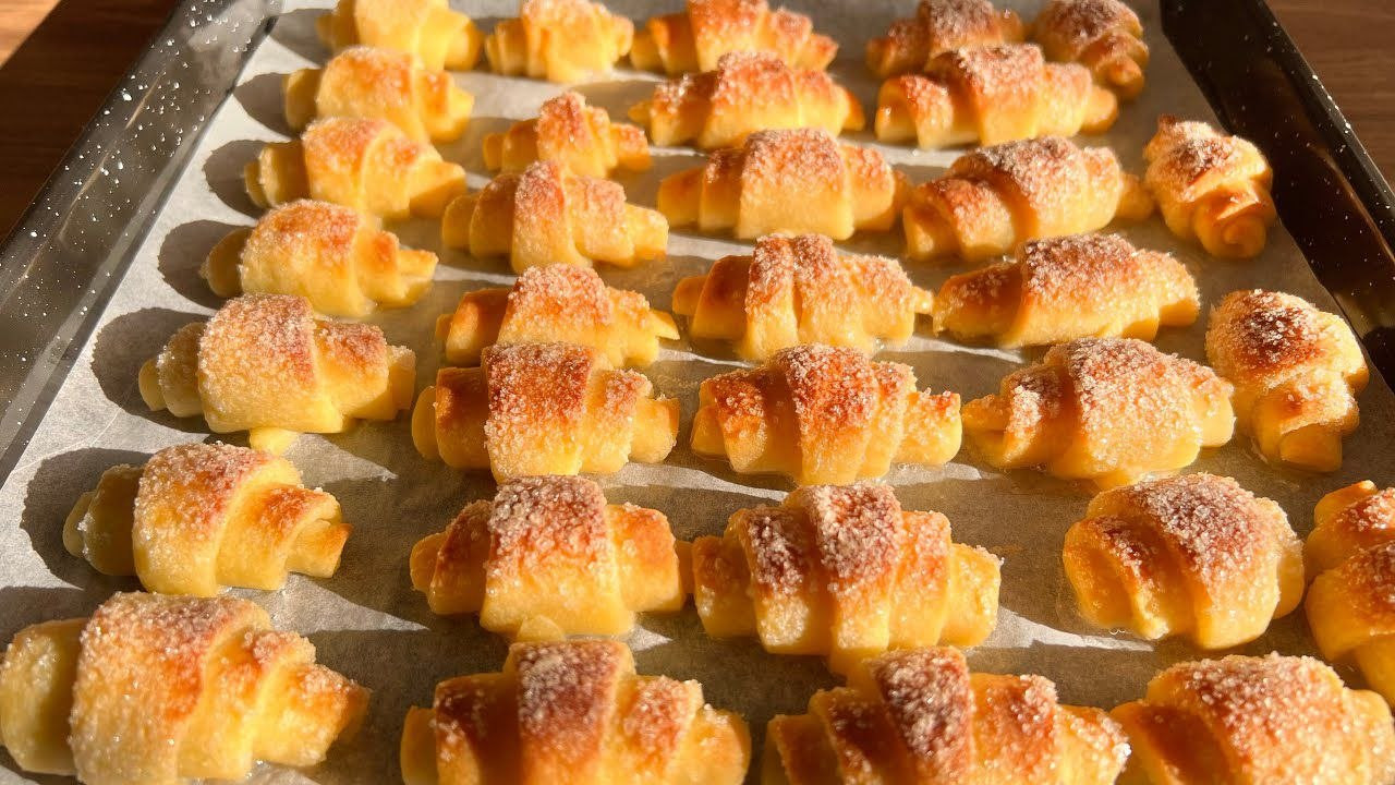 Ножом разрежьте тесто на длинные треугольники, которые надо скатать в рогалики. Выкладывайте их на противень, застеленный пергаментом, предварительно обмакивая в сахар. Выпекайте при 180 градусах 15-20 минут. Перед подачей дайте выпечке немного остыть.