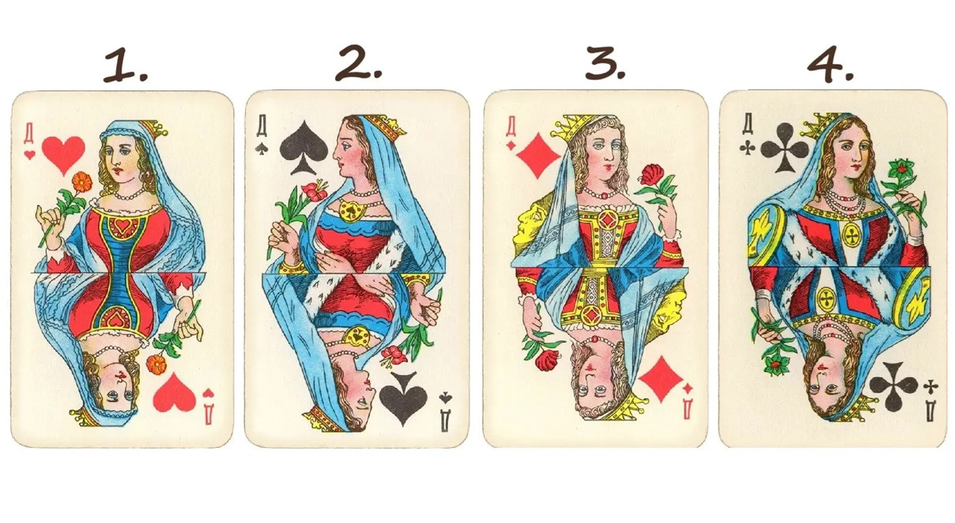 Предлагаем прекрасным дамам взглянуть на иллюстрацию: карта какой масти вам импонирует больше всего? Доверьтесь своей интуиции, она никогда не лжет, так как говорит на языке ваших истинных чувств.