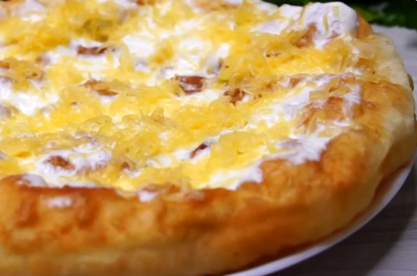 Горячую лепёшку смазываем заранее приготовленным соусом (сметаной, смешанной с измельчённым чесноком) и посыпаем натёртым не мелкой тёрке сыром.