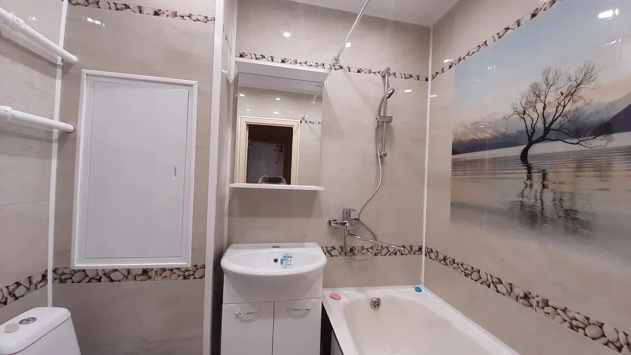 Это тот самый эконом-вариант, который порадует опрятным результатом в санузле. Замерьте площадь стен и прибавьте 10% на обрезку материала. Также понадобятся стартовые и стыковочные уголки. Если планируете закрывать трубы, приобретите профиль для гипсокартона и ревизионный люк.